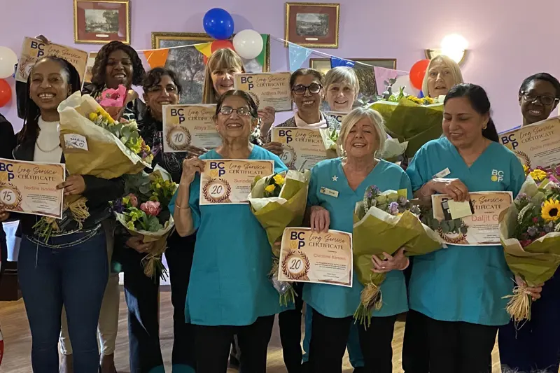BCOP CEO Helen Gore, who presented the certificates, vouchers and flowers commented on the contrast between BCOP care home staff and UK social care generally, where staff turnover is typically over 30% a year. “It’s lovely to be able to show our appreciation for these special, talented people who have provided outstanding care here at Robert Harvey House for many, many years. “