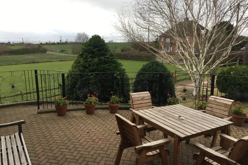 Chimnies has a sunny outdoor patio area overlooking a paddock with a Shetland pony (Cola) and Donkey (Berty).